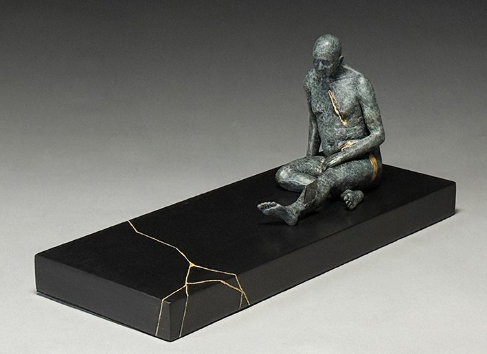 “Fall down seven times, get up eight” is a saying in Japanese culture that calls to the resilience and strength within each of us. Inspired by this, I tempered it with an acknowledgment of the severity of the pain and loss these falls can cause, and that moment of resignation we feel afterwards, right before gearing up to rise again. Kintsugi, another Japanese inspiration, is when broken pottery is mended by filling cracks in fired clay with gold or other precious materials, and is about embracing, highlighting, and finding the beauty within the flaws. With this piece I wanted to capture the whole of these inspirations - the fall, the pain, the resignation, the refusal to give up, and ultimately, the notion that in the long run, we can be better off, stronger, and more beautiful for our harshest trials.